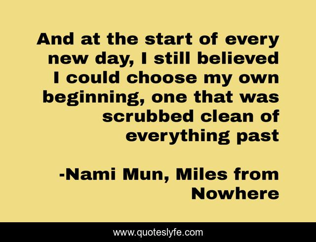 This page presents the quote "And at the start of every new day, I still believed I could choose my own beginning, one that was scrubbed clean of everything past". Author of this quote is Nami Mun, Miles from Nowhere. .