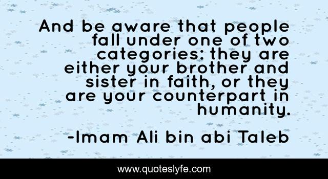 This page presents the quote "And be aware that people fall under one of two categories: they are either your brother and sister in faith, or they are your counterpart in humanity.". Author of this quote is Imam Ali bin abi Taleb. This quote is about forgiveness, humanity, relations-and-love,.