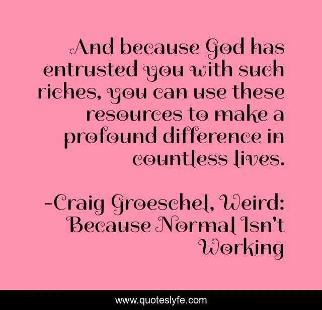 This page presents the quote "And because God has entrusted you with such riches, you can use these resources to make a profound difference in countless lives.". Author of this quote is Craig Groeschel, Weird: Because Normal Isn't Working. This quote is about a, use, because, entrusted, god, make, profound, riches, to,.