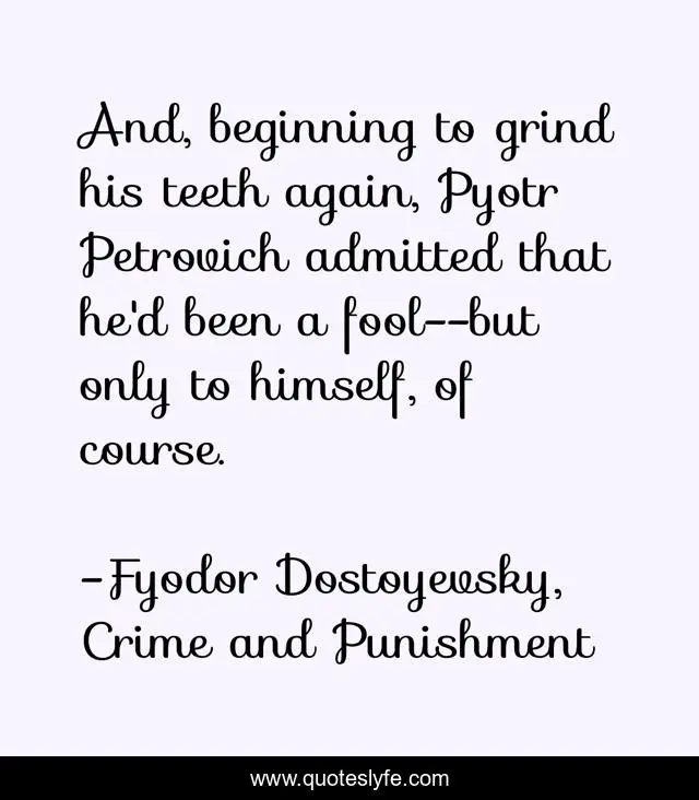 This page presents the quote "And, beginning to grind his teeth again, Pyotr Petrovich admitted that he'd been a fool--but only to himself, of course.". Author of this quote is Fyodor Dostoyevsky, Crime and Punishment. This quote is about fool, humor, mistakes, teeth, foolish, mistake,.