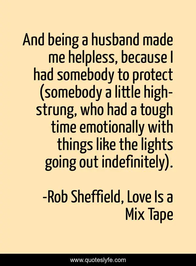 This page presents the quote "And being a husband made me helpless, because I had somebody to protect (somebody a little high-strung, who had a tough time emotionally with things like the lights going out indefinitely).". Author of this quote is Rob Sheffield, Love Is a Mix Tape. This quote is about helpless, marriage, protect, husband,.