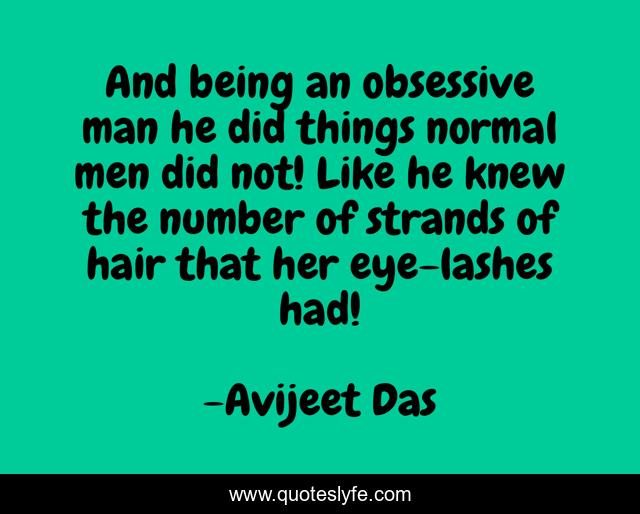This page presents the quote "And being an obsessive man he did things normal men did not! Like he knew the number of strands of hair that her eye-lashes had!". Author of this quote is Avijeet Das. This quote is about valentine-s-day, eyelashes, love, eyes, obsessive-man, obsessive-love, passionate-love, affection,.