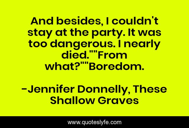 This page presents the quote "And besides, I couldn't stay at the party. It was too dangerous. I nearly died.""From what?""Boredom.". Author of this quote is Jennifer Donnelly, These Shallow Graves. This quote is about party, humor, boredom,.