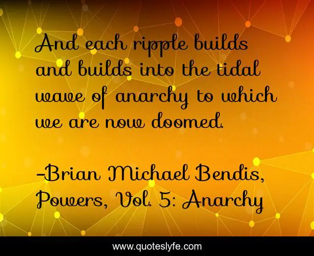 This page presents the quote "And each ripple builds and builds into the tidal wave of anarchy to which we are now doomed.". Author of this quote is Brian Michael Bendis, Powers, Vol. 5: Anarchy. This quote is about ripple, powers, doom, tidal-wave, anarchy,.