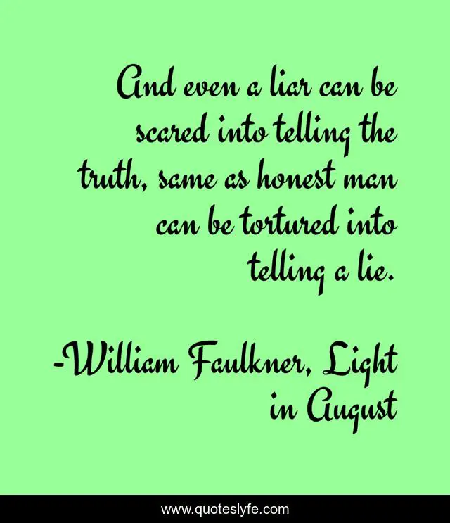 This page presents the quote "And even a liar can be scared into telling the truth, same as honest man can be tortured into telling a lie.". Author of this quote is William Faulkner, Light in August. This quote is about lie, honesty, truth,.