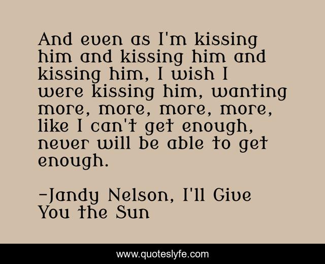 This page presents the quote "And even as I'm kissing him and kissing him and kissing him, I wish I were kissing him, wanting more, more, more, more, like I can't get enough, never will be able to get enough.". Author of this quote is Jandy Nelson, I'll Give You the Sun. This quote is about kissing, love, affection,.