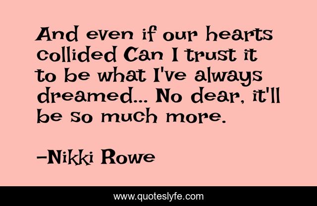 This page presents the quote "And even if our hearts collided Can I trust it to be what I've always dreamed... No dear, it'll be so much more.". Author of this quote is Nikki Rowe. This quote is about wanderlust, love, love-and-sayings, affection, free-spirit,.