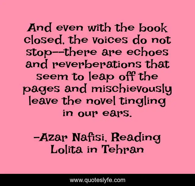 This page presents the quote "And even with the book closed, the voices do not stop--there are echoes and reverberations that seem to leap off the pages and mischievously leave the novel tingling in our ears.". Author of this quote is Azar Nafisi, Reading Lolita in Tehran. This quote is about voice, reading, novels,.