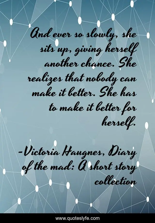 This page presents the quote "And ever so slowly, she sits up, giving herself another chance. She realizes that nobody can make it better. She has to make it better for herself.". Author of this quote is Victoria Haugnes, Diary of the mad: A short story collection. This quote is about better, well, hope,.