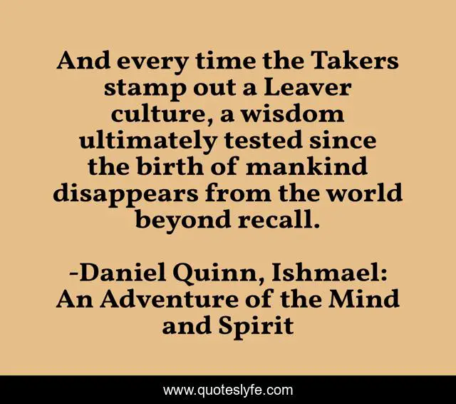 This page presents the quote "And every time the Takers stamp out a Leaver culture, a wisdom ultimately tested since the birth of mankind disappears from the world beyond recall.". Author of this quote is Daniel Quinn, Ishmael: An Adventure of the Mind and Spirit. .
