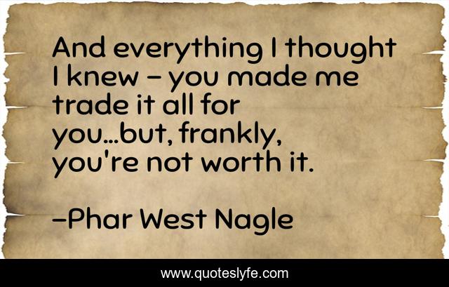 This page presents the quote "And everything I thought I knew - you made me trade it all for you...but, frankly, you're not worth it.". Author of this quote is Phar West Nagle. This quote is about relationships, heartbreak, hate, poetry,.