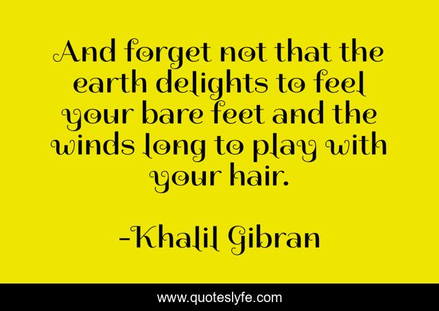 This page presents the quote "And forget not that the earth delights to feel your bare feet and the winds long to play with your hair.". Author of this quote is Khalil Gibran. This quote is about hair, feet, long,.