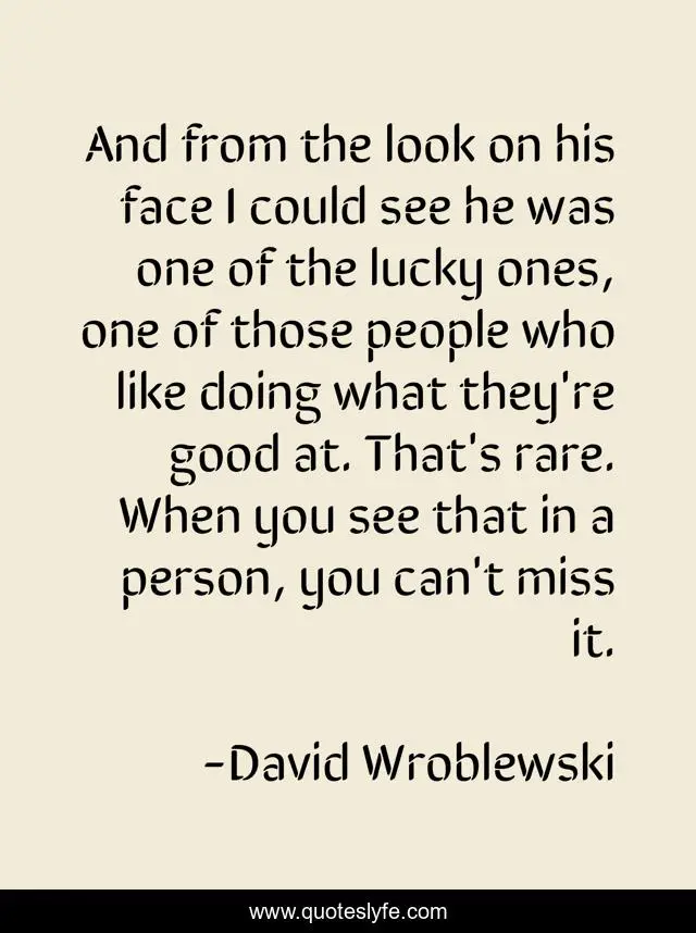 This page presents the quote "And from the look on his face I could see he was one of the lucky ones, one of those people who like doing what they're good at. That's rare. When you see that in a person, you can't miss it.". Author of this quote is David Wroblewski. This quote is about work, passion,.