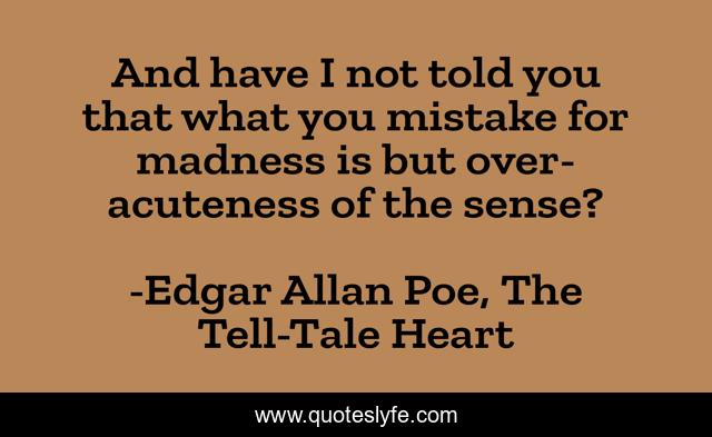 This page presents the quote "And have I not told you that what you mistake for madness is but over-acuteness of the sense?". Author of this quote is Edgar Allan Poe, The Tell-Tale Heart. This quote is about intelligence, madness,.