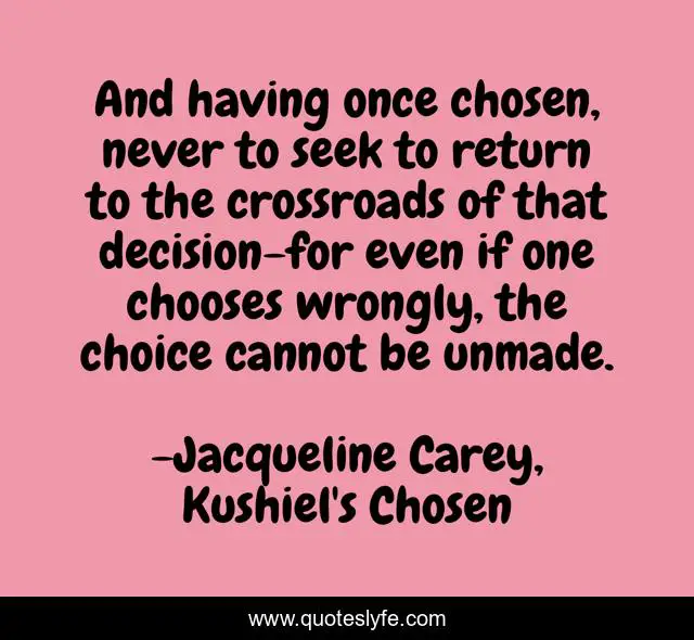 This page presents the quote "And having once chosen, never to seek to return to the crossroads of that decision-for even if one chooses wrongly, the choice cannot be unmade.". Author of this quote is Jacqueline Carey, Kushiel's Chosen. This quote is about death, inspirational, crossroads, truth, enthusiasm, choices, life-lessons,.