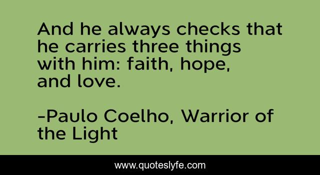 This page presents the quote "And he always checks that he carries three things with him: faith, hope, and love.". Author of this quote is Paulo Coelho, Warrior of the Light. This quote is about faith, novel, love, warrior, coelho, paulo, hope, affection,.