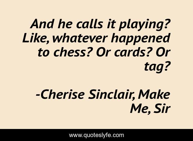 This page presents the quote "And he calls it playing? Like, whatever happened to chess? Or cards? Or tag?". Author of this quote is Cherise Sinclair, Make Me, Sir. This quote is about erotica, make-me-sir, cherise-sinclair,.