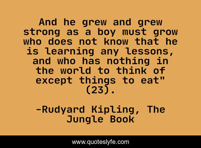 This page presents the quote "And he grew and grew strong as a boy must grow who does not know that he is learning any lessons, and who has nothing in the world to think of except things to eat" (23).". Author of this quote is Rudyard Kipling, The Jungle Book. .