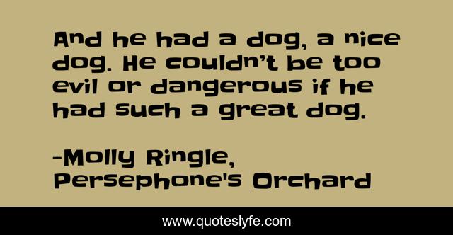 This page presents the quote "And he had a dog, a nice dog. He couldn’t be too evil or dangerous if he had such a great dog.". Author of this quote is Molly Ringle, Persephone's Orchard. This quote is about dogs, pets,.