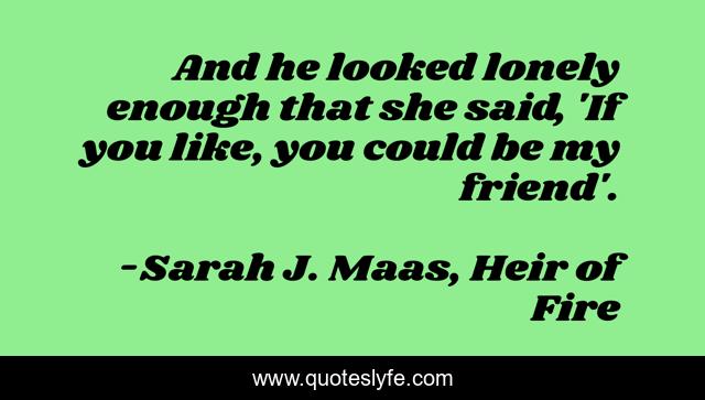 This page presents the quote "And he looked lonely enough that she said, 'If you like, you could be my friend'.". Author of this quote is Sarah J. Maas, Heir of Fire. This quote is about liitle-dorian, kids, loneliness, little-aelin, aelin-galathynius, friendship, dorian-havilliard,.