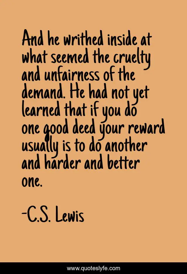 This page presents the quote "And he writhed inside at what seemed the cruelty and unfairness of the demand. He had not yet learned that if you do one good deed your reward usually is to do another and harder and better one.". Author of this quote is C.S. Lewis. This quote is about good, cruelty, better, demand, unfairness, deed, reward,.