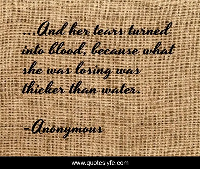 This page presents the quote "...And her tears turned into blood, because what she was losing was thicker than water.". Author of this quote is Anonymous. This quote is about loss, blood, crying,.