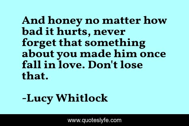 This page presents the quote "And honey no matter how bad it hurts, never forget that something about you made him once fall in love. Don't lose that.". Author of this quote is Lucy Whitlock. This quote is about relationships, advice, loveyourself, love, affection,.