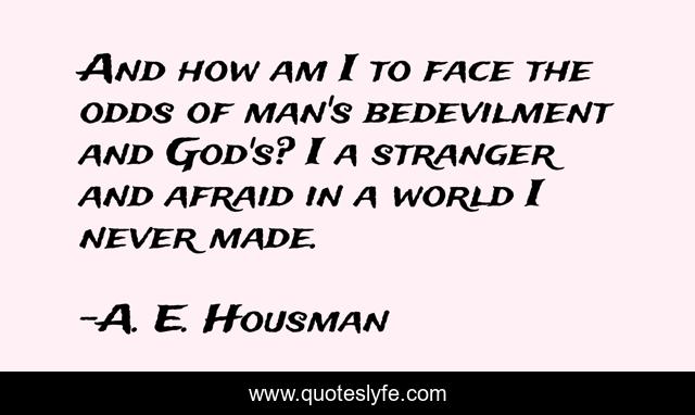 This page presents the quote "And how am I to face the odds of man's bedevilment and God's? I a stranger and afraid in a world I never made.". Author of this quote is A. E. Housman. .