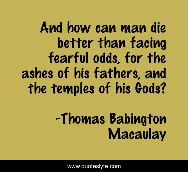 This page presents the quote "And how can man die better than facing fearful odds, for the ashes of his fathers, and the temples of his Gods?". Author of this quote is Thomas Babington Macaulay. This quote is about better, die, man,.