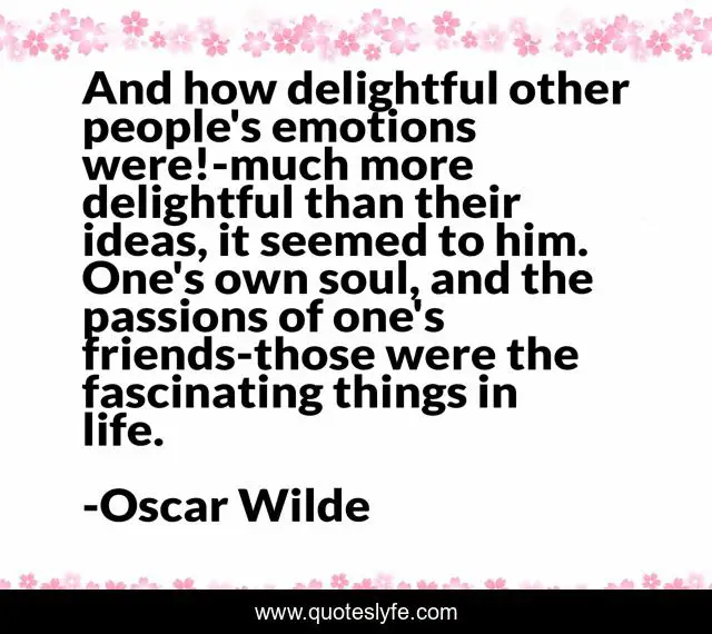 This page presents the quote "And how delightful other people's emotions were!-much more delightful than their ideas, it seemed to him. One's own soul, and the passions of one's friends-those were the fascinating things in life.". Author of this quote is Oscar Wilde. This quote is about fascinating-things-in-lif, soul, emotions,.