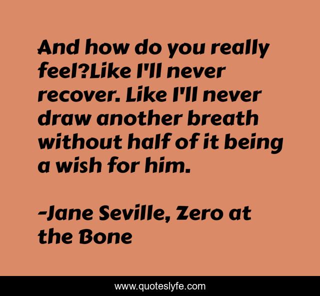 This page presents the quote "And how do you really feel?Like I'll never recover. Like I'll never draw another breath without half of it being a wish for him.". Author of this quote is Jane Seville, Zero at the Bone. .