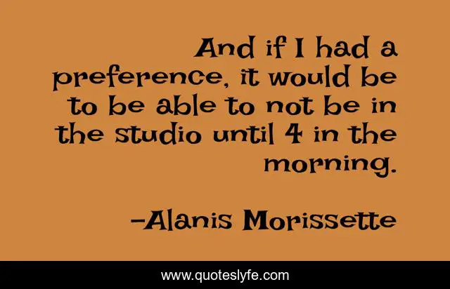 This page presents the quote "And if I had a preference, it would be to be able to not be in the studio until 4 in the morning.". Author of this quote is Alanis Morissette. This quote is about studio, until,.