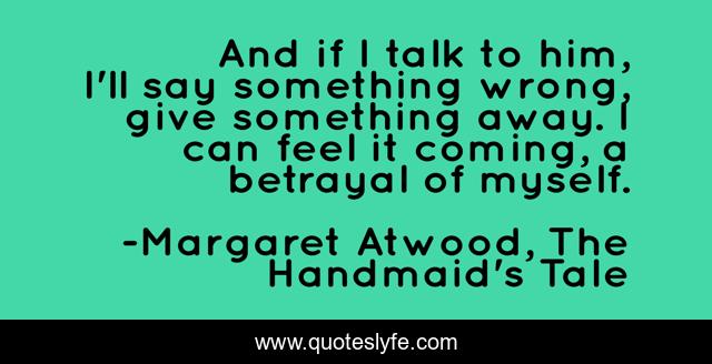 This page presents the quote "And if I talk to him, I'll say something wrong, give something away. I can feel it coming, a betrayal of myself.". Author of this quote is Margaret Atwood, The Handmaid's Tale. This quote is about secrets, anxiety,.