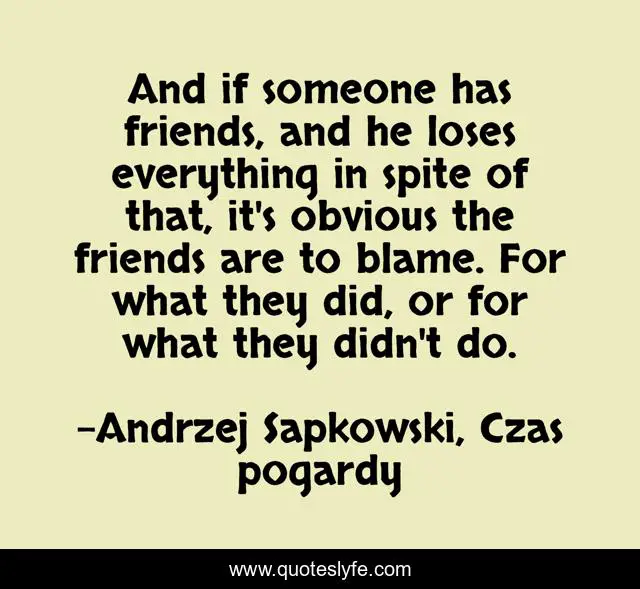 This page presents the quote "And if someone has friends, and he loses everything in spite of that, it's obvious the friends are to blame. For what they did, or for what they didn't do.". Author of this quote is Andrzej Sapkowski, Czas pogardy. .