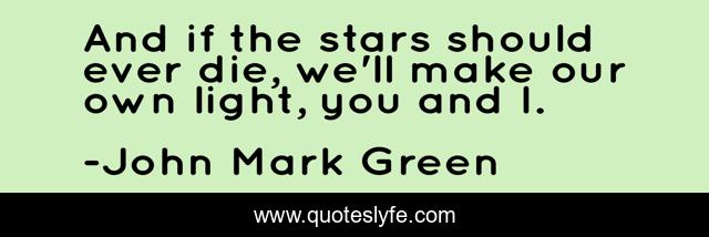 This page presents the quote "And if the stars should ever die, we'll make our own light, you and I.". Author of this quote is John Mark Green. This quote is about lovers, love, romantic, relationship, light, passion, stars, affection,.