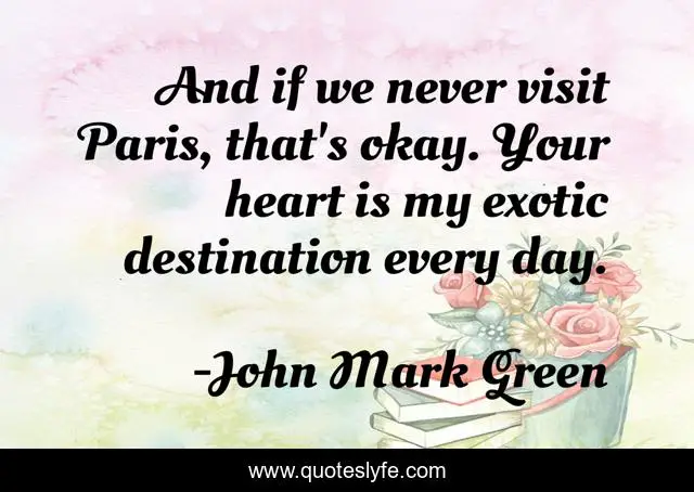 This page presents the quote "And if we never visit Paris, that's okay. Your heart is my exotic destination every day.". Author of this quote is John Mark Green. This quote is about exotic, heart, love, romantic, relationship, paris, quotes-about-love, affection,.