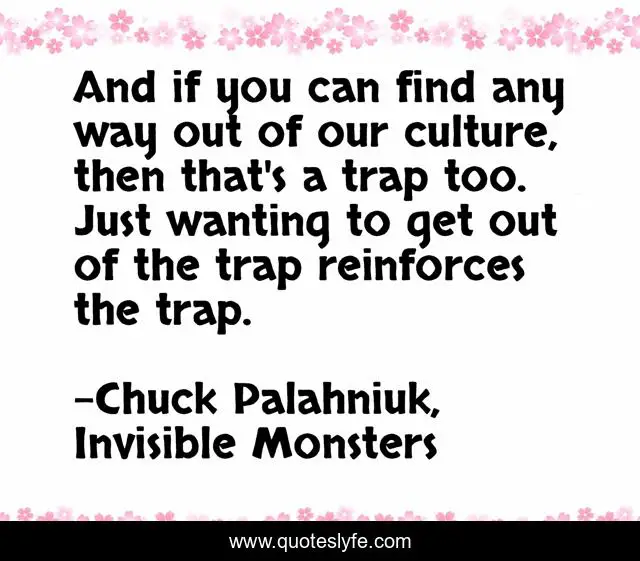 This page presents the quote "And if you can find any way out of our culture, then that's a trap too. Just wanting to get out of the trap reinforces the trap.". Author of this quote is Chuck Palahniuk, Invisible Monsters. This quote is about culture, invisible-monsters, trap, traps, trapped,.