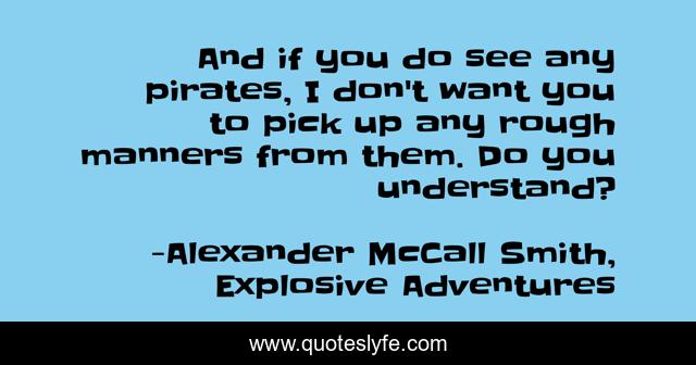This page presents the quote "And if you do see any pirates, I don't want you to pick up any rough manners from them. Do you understand?". Author of this quote is Alexander McCall Smith, Explosive Adventures. This quote is about teaching, manners,.