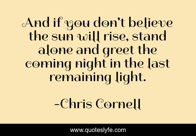 This page presents the quote "And if you don't believe the sun will rise, stand alone and greet the coming night in the last remaining light.". Author of this quote is Chris Cornell. This quote is about light, believe, sun,.