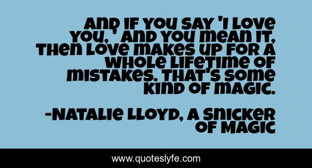This page presents the quote "And if you say 'I love you, ' and you mean it, then love makes up for a whole lifetime of mistakes. That's some kind of magic.". Author of this quote is Natalie Lloyd, A Snicker of Magic. This quote is about magic, mistakes, love, forgiveness, affection,.