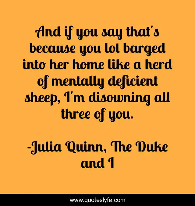 This page presents the quote "And if you say that's because you lot barged into her home like a herd of mentally deficient sheep, I'm disowning all three of you.". Author of this quote is Julia Quinn, The Duke and I. This quote is about romance, humor, julia-quinn,.