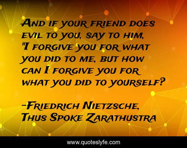 This page presents the quote "And if your friend does evil to you, say to him, ''I forgive you for what you did to me, but how can I forgive you for what you did to yourself?". Author of this quote is Friedrich Nietzsche, Thus Spoke Zarathustra. .