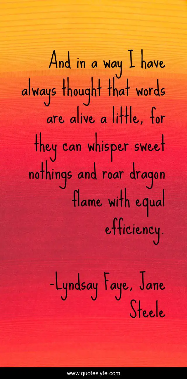 This page presents the quote "And in a way I have always thought that words are alive a little, for they can whisper sweet nothings and roar dragon flame with equal efficiency.". Author of this quote is Lyndsay Faye, Jane Steele. This quote is about books, reading, words, fiction,.
