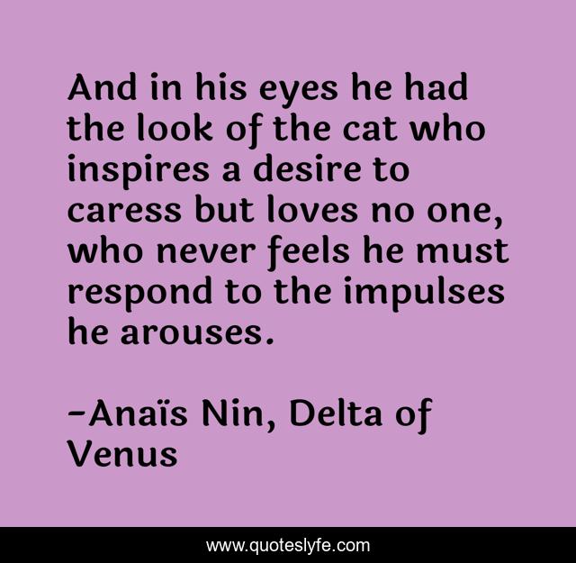 This page presents the quote "And in his eyes he had the look of the cat who inspires a desire to caress but loves no one, who never feels he must respond to the impulses he arouses.". Author of this quote is Anaïs Nin, Delta of Venus. This quote is about arousal, desire, delta-of-venus, anais-nin, cat,.