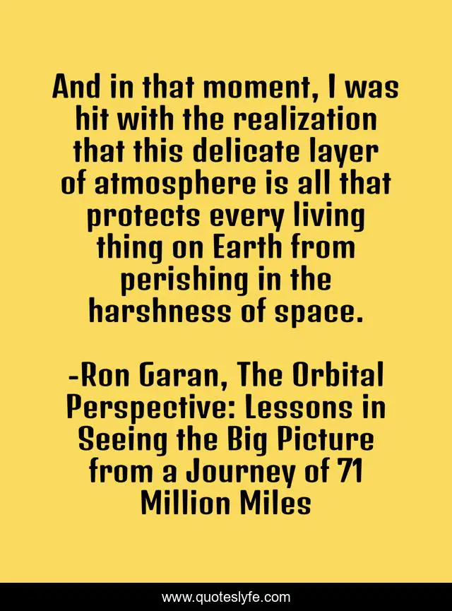 This page presents the quote "And in that moment, I was hit with the realization that this delicate layer of atmosphere is all that protects every living thing on Earth from perishing in the harshness of space.". Author of this quote is Ron Garan, The Orbital Perspective: Lessons in Seeing the Big Picture from a Journey of 71 Million Miles. This quote is about earth-from-space, outer-space, space-station, astronaut, earth, planet-earth, space-exploration, spaceship,.
