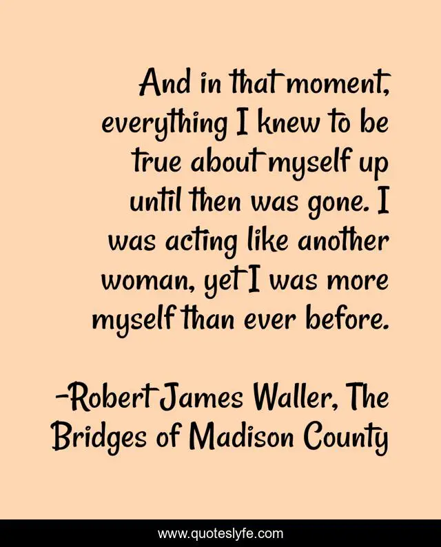 This page presents the quote "And in that moment, everything I knew to be true about myself up until then was gone. I was acting like another woman, yet I was more myself than ever before.". Author of this quote is Robert James Waller, The Bridges of Madison County. This quote is about self-realization, awareness, truth, discovery, hope, women,.