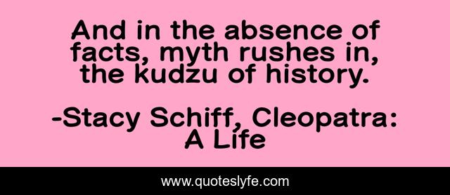 This page presents the quote "And in the absence of facts, myth rushes in, the kudzu of history.". Author of this quote is Stacy Schiff, Cleopatra: A Life. This quote is about accuracy, facts-and-ideas, myth, history,.