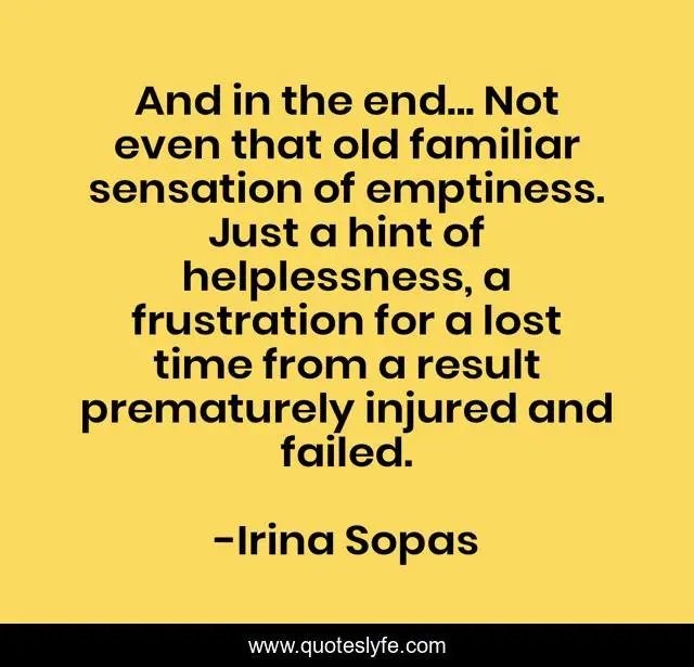 This page presents the quote "And in the end... Not even that old familiar sensation of emptiness. Just a hint of helplessness, a frustration for a lost time from a result prematurely injured and failed.". Author of this quote is Irina Sopas. This quote is about sadness, emptiness, love, affection,.