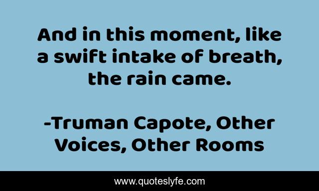 This page presents the quote "And in this moment, like a swift intake of breath, the rain came.". Author of this quote is Truman Capote, Other Voices, Other Rooms. .
