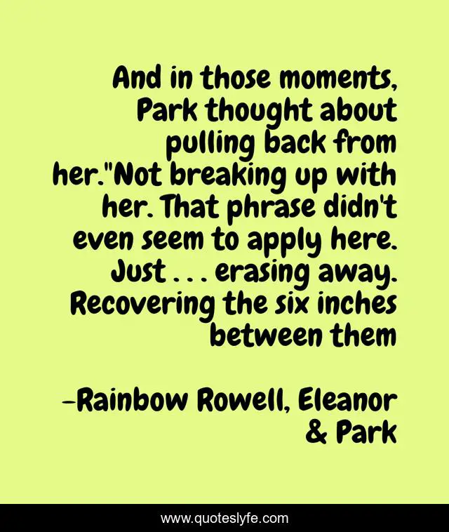 This page presents the quote "And in those moments, Park thought about pulling back from her."Not breaking up with her. That phrase didn't even seem to apply here. Just . . . erasing away. Recovering the six inches between them". Author of this quote is Rainbow Rowell, Eleanor & Park. This quote is about distance, love, relationship, fear, affection, eleanor-and-park,.